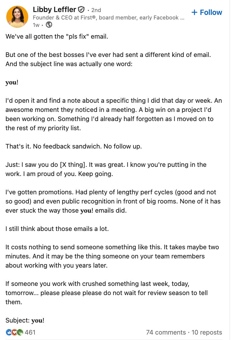 One specific observation. No judgment. Just: I saw you do that. It was great. Keep going. That’s it. And yet, Libby still thinks about those emails years later.